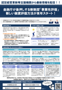 「事業性評価」とは、財務内容や担保・保証では測れない企業の事業内容や将来性を評価する新しい融資の考え方です。 2026年から始まる「企業価値担保権付き融資」により、今までの財務内容重視の評価では融資を受けにくかった企業も将来性を重視した評価が受けられます。 詳しくは以下の画像をご覧ください。
