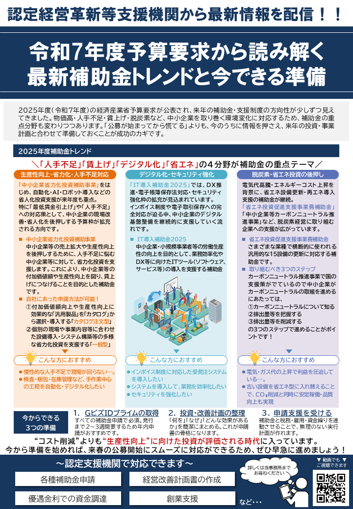 2025年度の補助金は、「人手不足」「賃上げ」「デジタル化」「省エネ」が重点となっております。