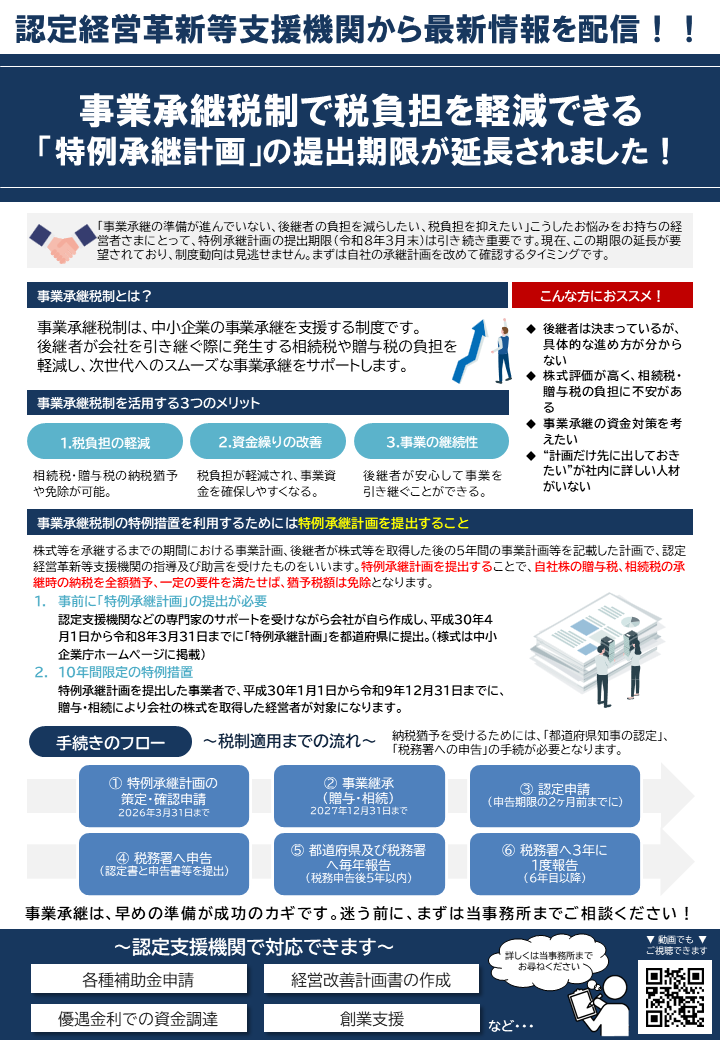 こんにちは、こいのぼりの松田です。 事業承継税制で税負担を軽減できる『特例承継計画』の提出期限が令和8年3月末に延長されています。 「事業承継の準備が進んでいない、後継者の負担を減らしたい、税負担を抑えたい」