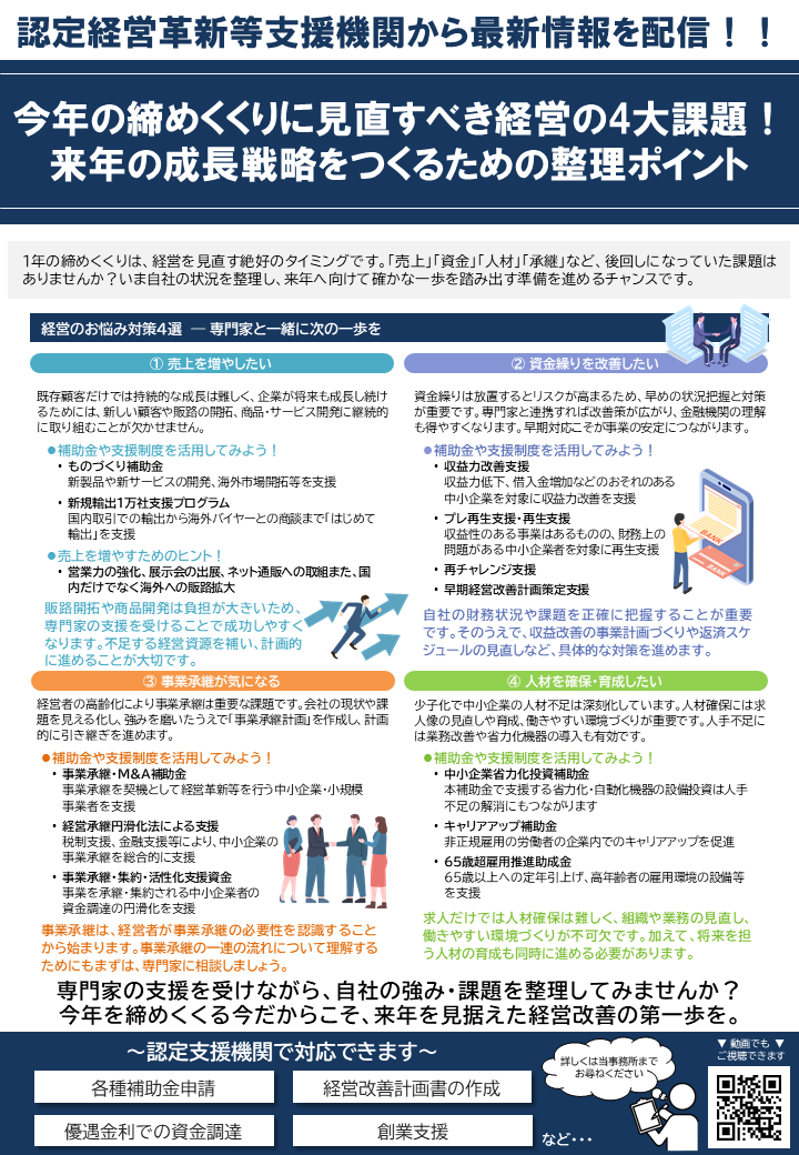本日は今年の締めくくりに「売上」「資金」「人材」「承継」の4つのテーマごとに、 現状の課題と解決へのヒント、そして活用できる支援制度について解説しています。