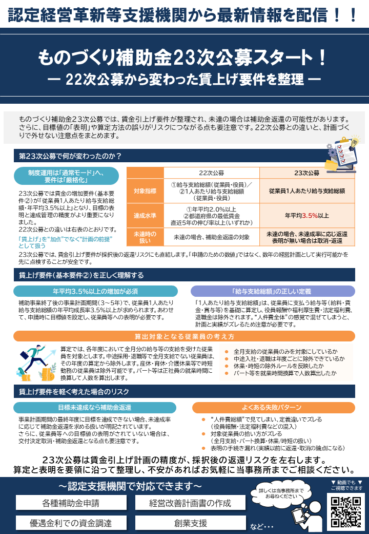 23次公募で厳格化された賃上げ要件を中心に22次との違い、算定方法、返還リスクを実務目線で解説しています。